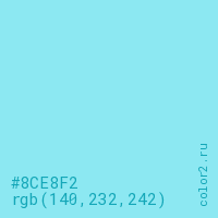 Цвет #8CE8F2 в цветовой модели RGB обозначается тремя октетами (140, 232, 242) в десятичном формате и #8CE8F2 в шестнадцатиричном (hex) формате, которые являются интенсивностью красного 140 (hex 8C), интенсивность зелёного 232 (hex E8) и интенсивность синего 242 (hex F2).