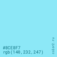 Цвет #8CE8F7 в цветовой модели RGB обозначается тремя октетами (140, 232, 247) в десятичном формате и #8CE8F7 в шестнадцатиричном (hex) формате, которые являются интенсивностью красного 140 (hex 8C), интенсивность зелёного 232 (hex E8) и интенсивность синего 247 (hex F7).