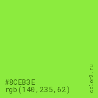 Цвет #8CEB3E в цветовой модели RGB обозначается тремя октетами (140, 235, 62) в десятичном формате и #8CEB3E в шестнадцатиричном (hex) формате, которые являются интенсивностью красного 140 (hex 8C), интенсивность зелёного 235 (hex EB) и интенсивность синего 62 (hex 3E).