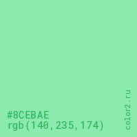 Цвет #8CEBAE в цветовой модели RGB обозначается тремя октетами (140, 235, 174) в десятичном формате и #8CEBAE в шестнадцатиричном (hex) формате, которые являются интенсивностью красного 140 (hex 8C), интенсивность зелёного 235 (hex EB) и интенсивность синего 174 (hex AE).