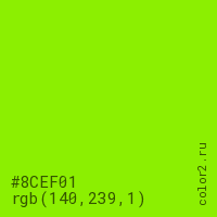 Цвет #8CEF01 в цветовой модели RGB обозначается тремя октетами (140, 239, 1) в десятичном формате и #8CEF01 в шестнадцатиричном (hex) формате, которые являются интенсивностью красного 140 (hex 8C), интенсивность зелёного 239 (hex EF) и интенсивность синего 1 (hex 01).