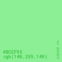 Цвет #8CEF95 в цветовой модели RGB обозначается тремя октетами (140, 239, 149) в десятичном формате и #8CEF95 в шестнадцатиричном (hex) формате, которые являются интенсивностью красного 140 (hex 8C), интенсивность зелёного 239 (hex EF) и интенсивность синего 149 (hex 95).