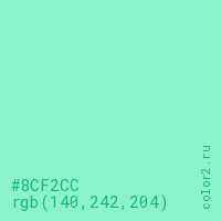 Цвет #8CF2CC в цветовой модели RGB обозначается тремя октетами (140, 242, 204) в десятичном формате и #8CF2CC в шестнадцатиричном (hex) формате, которые являются интенсивностью красного 140 (hex 8C), интенсивность зелёного 242 (hex F2) и интенсивность синего 204 (hex CC).