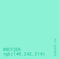 Цвет #8CF2D6 в цветовой модели RGB обозначается тремя октетами (140, 242, 214) в десятичном формате и #8CF2D6 в шестнадцатиричном (hex) формате, которые являются интенсивностью красного 140 (hex 8C), интенсивность зелёного 242 (hex F2) и интенсивность синего 214 (hex D6).