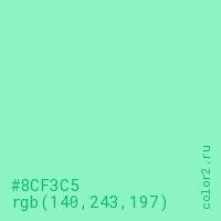 Цвет #8CF3C5 в цветовой модели RGB обозначается тремя октетами (140, 243, 197) в десятичном формате и #8CF3C5 в шестнадцатиричном (hex) формате, которые являются интенсивностью красного 140 (hex 8C), интенсивность зелёного 243 (hex F3) и интенсивность синего 197 (hex C5).
