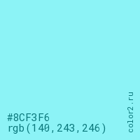 Цвет #8CF3F6 в цветовой модели RGB обозначается тремя октетами (140, 243, 246) в десятичном формате и #8CF3F6 в шестнадцатиричном (hex) формате, которые являются интенсивностью красного 140 (hex 8C), интенсивность зелёного 243 (hex F3) и интенсивность синего 246 (hex F6).