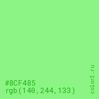 Цвет #8CF485 в цветовой модели RGB обозначается тремя октетами (140, 244, 133) в десятичном формате и #8CF485 в шестнадцатиричном (hex) формате, которые являются интенсивностью красного 140 (hex 8C), интенсивность зелёного 244 (hex F4) и интенсивность синего 133 (hex 85).