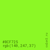 Цвет #8CF725 в цветовой модели RGB обозначается тремя октетами (140, 247, 37) в десятичном формате и #8CF725 в шестнадцатиричном (hex) формате, которые являются интенсивностью красного 140 (hex 8C), интенсивность зелёного 247 (hex F7) и интенсивность синего 37 (hex 25).