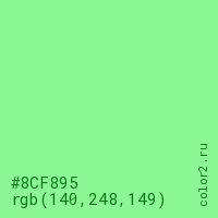 Цвет #8CF895 в цветовой модели RGB обозначается тремя октетами (140, 248, 149) в десятичном формате и #8CF895 в шестнадцатиричном (hex) формате, которые являются интенсивностью красного 140 (hex 8C), интенсивность зелёного 248 (hex F8) и интенсивность синего 149 (hex 95).