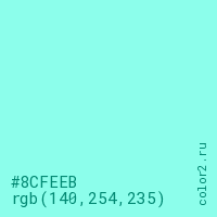 Цвет #8CFEEB в цветовой модели RGB обозначается тремя октетами (140, 254, 235) в десятичном формате и #8CFEEB в шестнадцатиричном (hex) формате, которые являются интенсивностью красного 140 (hex 8C), интенсивность зелёного 254 (hex FE) и интенсивность синего 235 (hex EB).