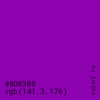 Цвет #8D03B0 в цветовой модели RGB обозначается тремя октетами (141, 3, 176) в десятичном формате и #8D03B0 в шестнадцатиричном (hex) формате, которые являются интенсивностью красного 141 (hex 8D), интенсивность зелёного 3 (hex 03) и интенсивность синего 176 (hex B0).