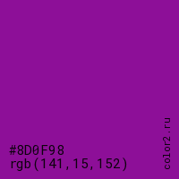 Цвет #8D0F98 в цветовой модели RGB обозначается тремя октетами (141, 15, 152) в десятичном формате и #8D0F98 в шестнадцатиричном (hex) формате, которые являются интенсивностью красного 141 (hex 8D), интенсивность зелёного 15 (hex 0F) и интенсивность синего 152 (hex 98).