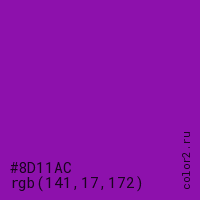 Цвет #8D11AC в цветовой модели RGB обозначается тремя октетами (141, 17, 172) в десятичном формате и #8D11AC в шестнадцатиричном (hex) формате, которые являются интенсивностью красного 141 (hex 8D), интенсивность зелёного 17 (hex 11) и интенсивность синего 172 (hex AC).