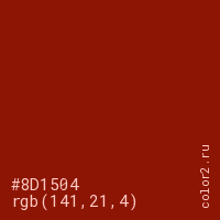 Цвет #8D1504 в цветовой модели RGB обозначается тремя октетами (141, 21, 4) в десятичном формате и #8D1504 в шестнадцатиричном (hex) формате, которые являются интенсивностью красного 141 (hex 8D), интенсивность зелёного 21 (hex 15) и интенсивность синего 4 (hex 04).