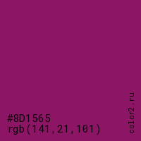 Цвет #8D1565 в цветовой модели RGB обозначается тремя октетами (141, 21, 101) в десятичном формате и #8D1565 в шестнадцатиричном (hex) формате, которые являются интенсивностью красного 141 (hex 8D), интенсивность зелёного 21 (hex 15) и интенсивность синего 101 (hex 65).