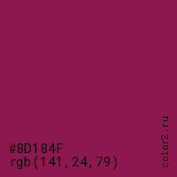 Цвет #8D184F в цветовой модели RGB обозначается тремя октетами (141, 24, 79) в десятичном формате и #8D184F в шестнадцатиричном (hex) формате, которые являются интенсивностью красного 141 (hex 8D), интенсивность зелёного 24 (hex 18) и интенсивность синего 79 (hex 4F).