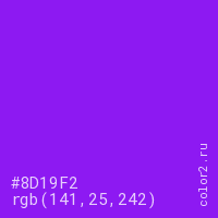 Цвет #8D19F2 в цветовой модели RGB обозначается тремя октетами (141, 25, 242) в десятичном формате и #8D19F2 в шестнадцатиричном (hex) формате, которые являются интенсивностью красного 141 (hex 8D), интенсивность зелёного 25 (hex 19) и интенсивность синего 242 (hex F2).
