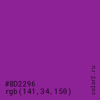 Цвет #8D2296 в цветовой модели RGB обозначается тремя октетами (141, 34, 150) в десятичном формате и #8D2296 в шестнадцатиричном (hex) формате, которые являются интенсивностью красного 141 (hex 8D), интенсивность зелёного 34 (hex 22) и интенсивность синего 150 (hex 96).