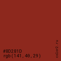 Цвет #8D281D в цветовой модели RGB обозначается тремя октетами (141, 40, 29) в десятичном формате и #8D281D в шестнадцатиричном (hex) формате, которые являются интенсивностью красного 141 (hex 8D), интенсивность зелёного 40 (hex 28) и интенсивность синего 29 (hex 1D).