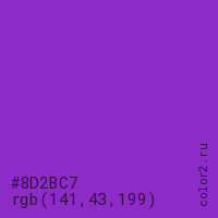 Цвет #8D2BC7 в цветовой модели RGB обозначается тремя октетами (141, 43, 199) в десятичном формате и #8D2BC7 в шестнадцатиричном (hex) формате, которые являются интенсивностью красного 141 (hex 8D), интенсивность зелёного 43 (hex 2B) и интенсивность синего 199 (hex C7).