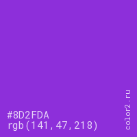Цвет #8D2FDA в цветовой модели RGB обозначается тремя октетами (141, 47, 218) в десятичном формате и #8D2FDA в шестнадцатиричном (hex) формате, которые являются интенсивностью красного 141 (hex 8D), интенсивность зелёного 47 (hex 2F) и интенсивность синего 218 (hex DA).