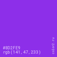 Цвет #8D2FE9 в цветовой модели RGB обозначается тремя октетами (141, 47, 233) в десятичном формате и #8D2FE9 в шестнадцатиричном (hex) формате, которые являются интенсивностью красного 141 (hex 8D), интенсивность зелёного 47 (hex 2F) и интенсивность синего 233 (hex E9).