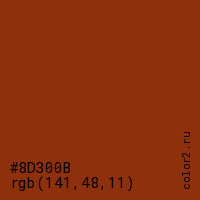 Цвет #8D300B в цветовой модели RGB обозначается тремя октетами (141, 48, 11) в десятичном формате и #8D300B в шестнадцатиричном (hex) формате, которые являются интенсивностью красного 141 (hex 8D), интенсивность зелёного 48 (hex 30) и интенсивность синего 11 (hex 0B).
