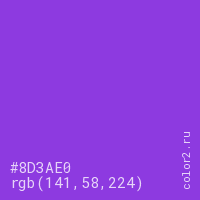 Цвет #8D3AE0 в цветовой модели RGB обозначается тремя октетами (141, 58, 224) в десятичном формате и #8D3AE0 в шестнадцатиричном (hex) формате, которые являются интенсивностью красного 141 (hex 8D), интенсивность зелёного 58 (hex 3A) и интенсивность синего 224 (hex E0).