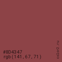 Цвет #8D4347 в цветовой модели RGB обозначается тремя октетами (141, 67, 71) в десятичном формате и #8D4347 в шестнадцатиричном (hex) формате, которые являются интенсивностью красного 141 (hex 8D), интенсивность зелёного 67 (hex 43) и интенсивность синего 71 (hex 47).