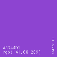 Цвет #8D44D1 в цветовой модели RGB обозначается тремя октетами (141, 68, 209) в десятичном формате и #8D44D1 в шестнадцатиричном (hex) формате, которые являются интенсивностью красного 141 (hex 8D), интенсивность зелёного 68 (hex 44) и интенсивность синего 209 (hex D1).