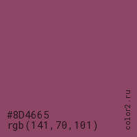 Цвет #8D4665 в цветовой модели RGB обозначается тремя октетами (141, 70, 101) в десятичном формате и #8D4665 в шестнадцатиричном (hex) формате, которые являются интенсивностью красного 141 (hex 8D), интенсивность зелёного 70 (hex 46) и интенсивность синего 101 (hex 65).