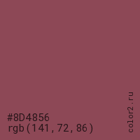 Цвет #8D4856 в цветовой модели RGB обозначается тремя октетами (141, 72, 86) в десятичном формате и #8D4856 в шестнадцатиричном (hex) формате, которые являются интенсивностью красного 141 (hex 8D), интенсивность зелёного 72 (hex 48) и интенсивность синего 86 (hex 56).