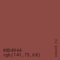 Цвет #8D4944 в цветовой модели RGB обозначается тремя октетами (141, 73, 68) в десятичном формате и #8D4944 в шестнадцатиричном (hex) формате, которые являются интенсивностью красного 141 (hex 8D), интенсивность зелёного 73 (hex 49) и интенсивность синего 68 (hex 44).
