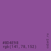 Цвет #8D4E98 в цветовой модели RGB обозначается тремя октетами (141, 78, 152) в десятичном формате и #8D4E98 в шестнадцатиричном (hex) формате, которые являются интенсивностью красного 141 (hex 8D), интенсивность зелёного 78 (hex 4E) и интенсивность синего 152 (hex 98).