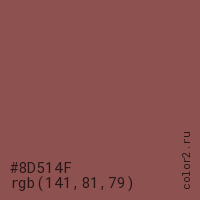Цвет #8D514F в цветовой модели RGB обозначается тремя октетами (141, 81, 79) в десятичном формате и #8D514F в шестнадцатиричном (hex) формате, которые являются интенсивностью красного 141 (hex 8D), интенсивность зелёного 81 (hex 51) и интенсивность синего 79 (hex 4F).