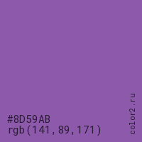 Цвет #8D59AB в цветовой модели RGB обозначается тремя октетами (141, 89, 171) в десятичном формате и #8D59AB в шестнадцатиричном (hex) формате, которые являются интенсивностью красного 141 (hex 8D), интенсивность зелёного 89 (hex 59) и интенсивность синего 171 (hex AB).
