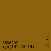 Цвет #8D620E в цветовой модели RGB обозначается тремя октетами (141, 98, 14) в десятичном формате и #8D620E в шестнадцатиричном (hex) формате, которые являются интенсивностью красного 141 (hex 8D), интенсивность зелёного 98 (hex 62) и интенсивность синего 14 (hex 0E).