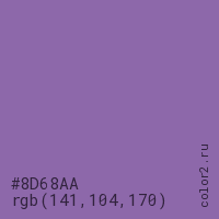 Цвет #8D68AA в цветовой модели RGB обозначается тремя октетами (141, 104, 170) в десятичном формате и #8D68AA в шестнадцатиричном (hex) формате, которые являются интенсивностью красного 141 (hex 8D), интенсивность зелёного 104 (hex 68) и интенсивность синего 170 (hex AA).