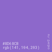Цвет #8D68CB в цветовой модели RGB обозначается тремя октетами (141, 104, 203) в десятичном формате и #8D68CB в шестнадцатиричном (hex) формате, которые являются интенсивностью красного 141 (hex 8D), интенсивность зелёного 104 (hex 68) и интенсивность синего 203 (hex CB).