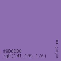 Цвет #8D6DB0 в цветовой модели RGB обозначается тремя октетами (141, 109, 176) в десятичном формате и #8D6DB0 в шестнадцатиричном (hex) формате, которые являются интенсивностью красного 141 (hex 8D), интенсивность зелёного 109 (hex 6D) и интенсивность синего 176 (hex B0).