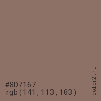 Цвет #8D7167 в цветовой модели RGB обозначается тремя октетами (141, 113, 103) в десятичном формате и #8D7167 в шестнадцатиричном (hex) формате, которые являются интенсивностью красного 141 (hex 8D), интенсивность зелёного 113 (hex 71) и интенсивность синего 103 (hex 67).