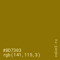 Цвет #8D7303 в цветовой модели RGB обозначается тремя октетами (141, 115, 3) в десятичном формате и #8D7303 в шестнадцатиричном (hex) формате, которые являются интенсивностью красного 141 (hex 8D), интенсивность зелёного 115 (hex 73) и интенсивность синего 3 (hex 03).