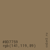 Цвет #8D7759 в цветовой модели RGB обозначается тремя октетами (141, 119, 89) в десятичном формате и #8D7759 в шестнадцатиричном (hex) формате, которые являются интенсивностью красного 141 (hex 8D), интенсивность зелёного 119 (hex 77) и интенсивность синего 89 (hex 59).