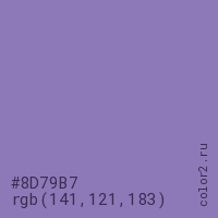 Цвет #8D79B7 в цветовой модели RGB обозначается тремя октетами (141, 121, 183) в десятичном формате и #8D79B7 в шестнадцатиричном (hex) формате, которые являются интенсивностью красного 141 (hex 8D), интенсивность зелёного 121 (hex 79) и интенсивность синего 183 (hex B7).