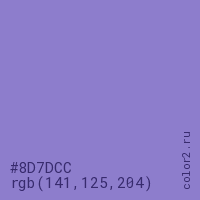 Цвет #8D7DCC в цветовой модели RGB обозначается тремя октетами (141, 125, 204) в десятичном формате и #8D7DCC в шестнадцатиричном (hex) формате, которые являются интенсивностью красного 141 (hex 8D), интенсивность зелёного 125 (hex 7D) и интенсивность синего 204 (hex CC).