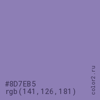 Цвет RGB(141, 126, 181) в процентом отношении количества цвета состоит из 55.3% красного (red), 49.4% зелёного (green) и 71% синего (blue).