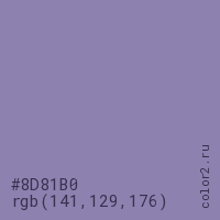 Цвет #8D81B0 в цветовой модели RGB обозначается тремя октетами (141, 129, 176) в десятичном формате и #8D81B0 в шестнадцатиричном (hex) формате, которые являются интенсивностью красного 141 (hex 8D), интенсивность зелёного 129 (hex 81) и интенсивность синего 176 (hex B0).