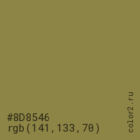 Цвет #8D8546 в цветовой модели RGB обозначается тремя октетами (141, 133, 70) в десятичном формате и #8D8546 в шестнадцатиричном (hex) формате, которые являются интенсивностью красного 141 (hex 8D), интенсивность зелёного 133 (hex 85) и интенсивность синего 70 (hex 46).