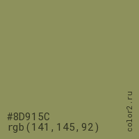 Цвет #8D915C в цветовой модели RGB обозначается тремя октетами (141, 145, 92) в десятичном формате и #8D915C в шестнадцатиричном (hex) формате, которые являются интенсивностью красного 141 (hex 8D), интенсивность зелёного 145 (hex 91) и интенсивность синего 92 (hex 5C).