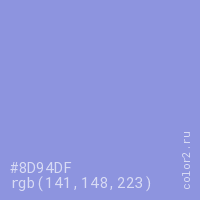 Цвет #8D94DF в цветовой модели RGB обозначается тремя октетами (141, 148, 223) в десятичном формате и #8D94DF в шестнадцатиричном (hex) формате, которые являются интенсивностью красного 141 (hex 8D), интенсивность зелёного 148 (hex 94) и интенсивность синего 223 (hex DF).